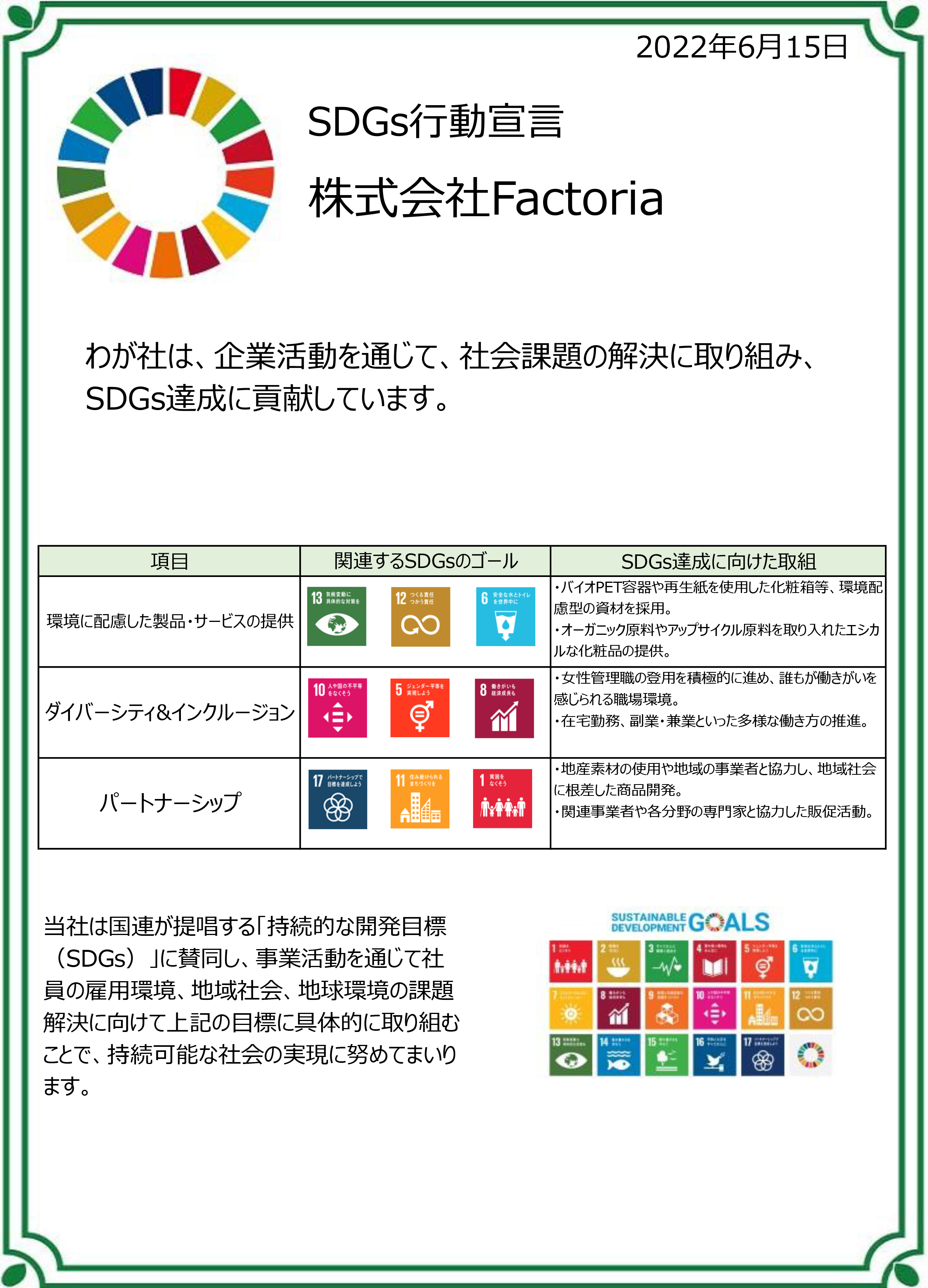 これらの達成に積極的に取り組むことを誓う「SDGs行動宣言」を策定いたしました。
